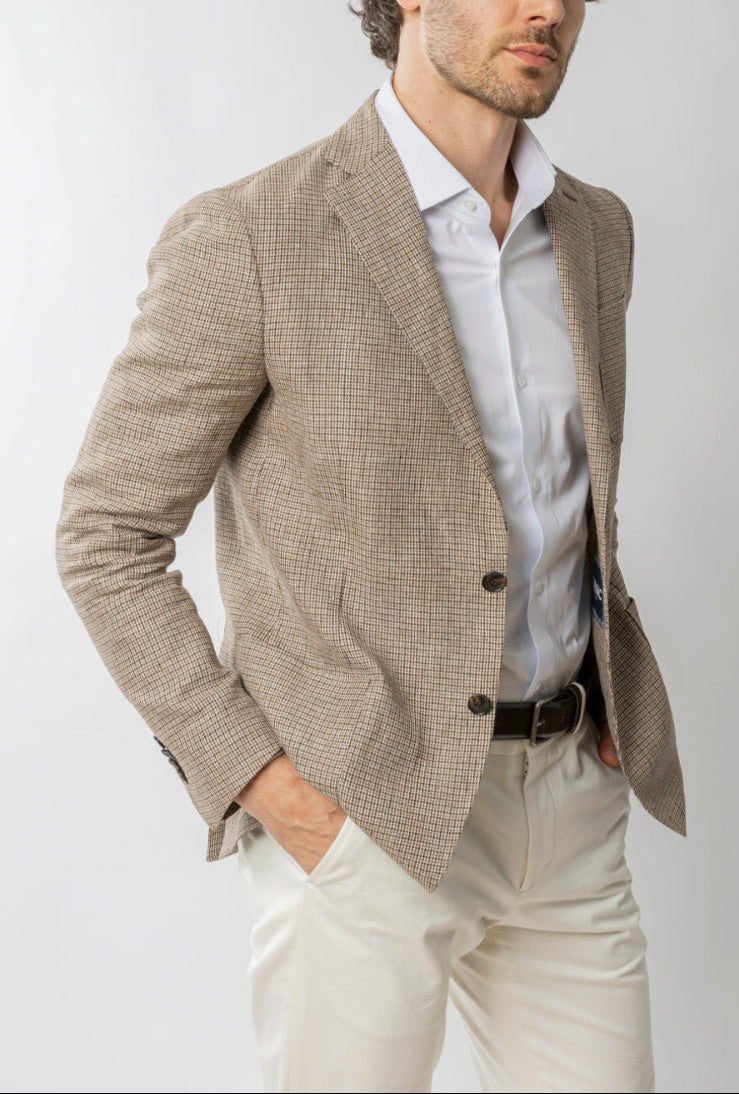 Blazer confecccionado em linho, na Itália, com padronagem xadrez em tons neutros de marrom.