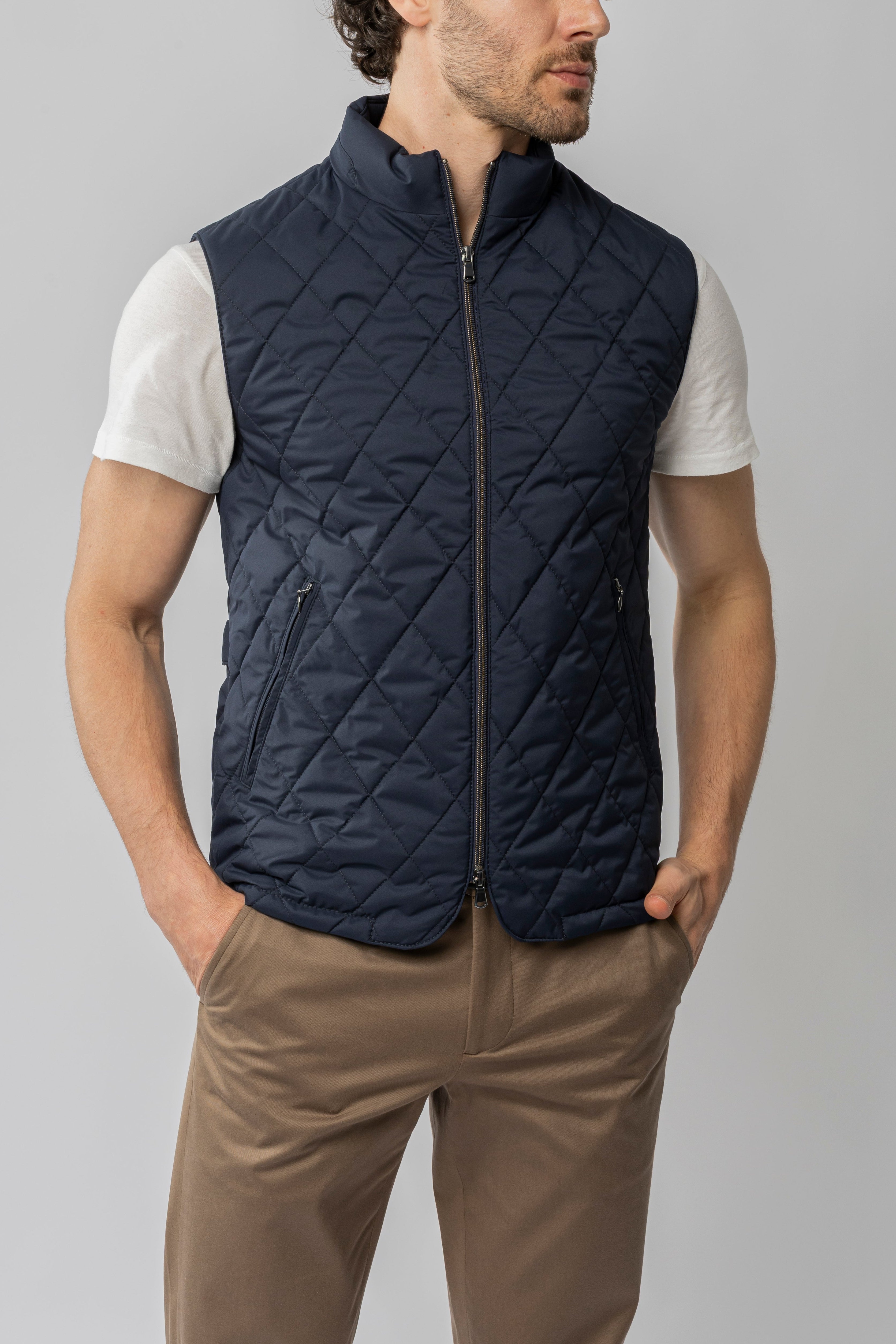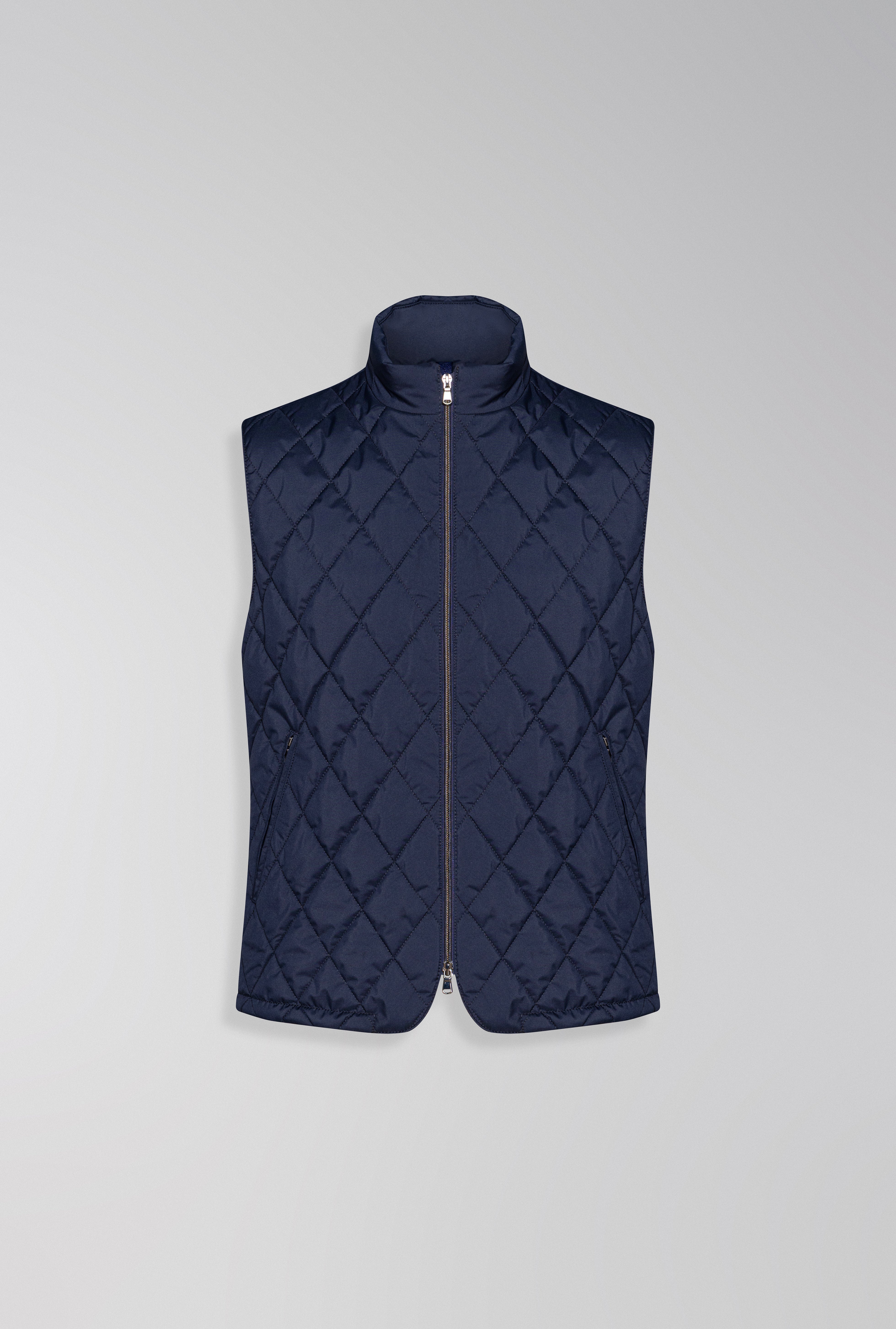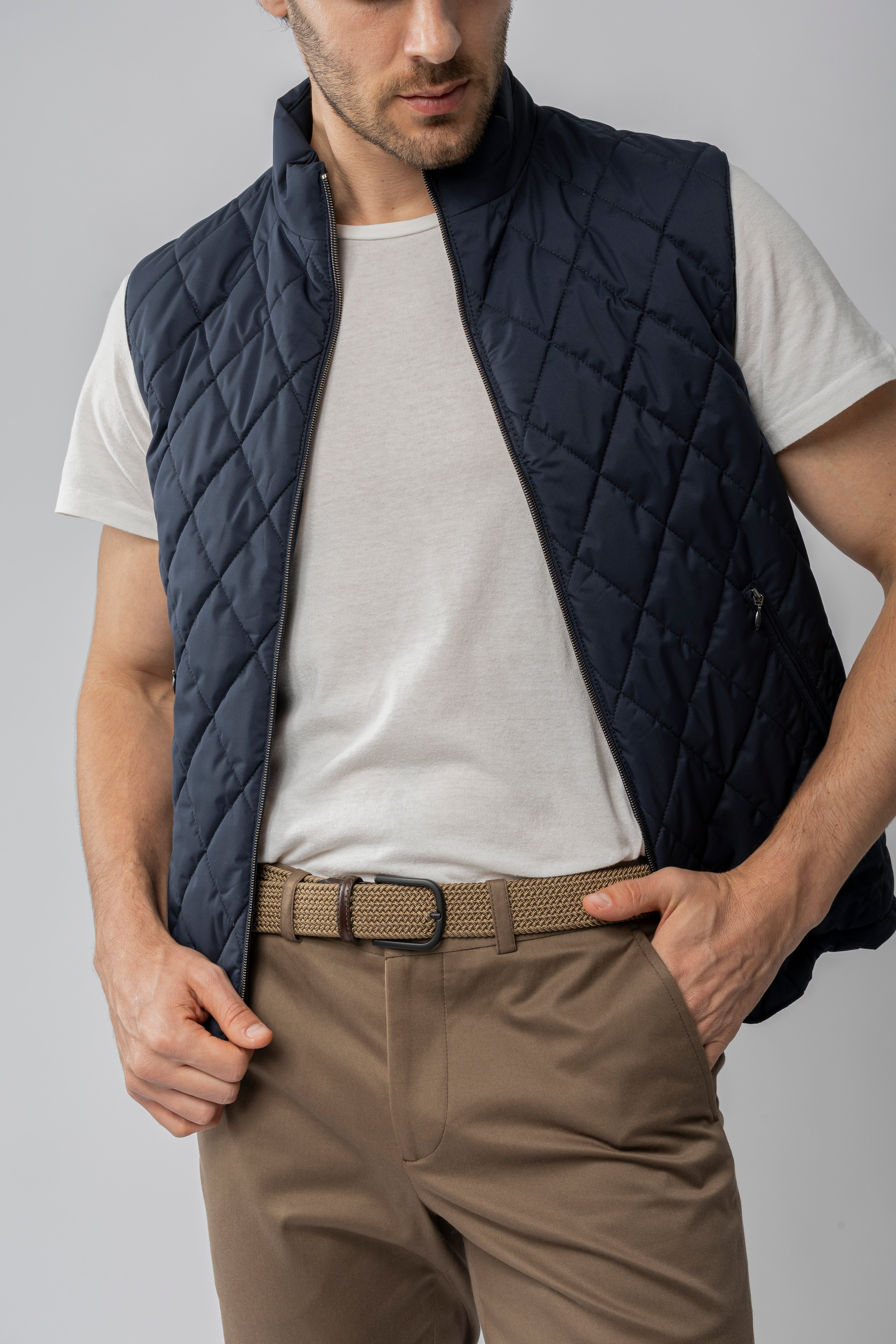 Colete confeccionado em tecido resistente a água, com detalhe em matelassê, produzido na Itália.