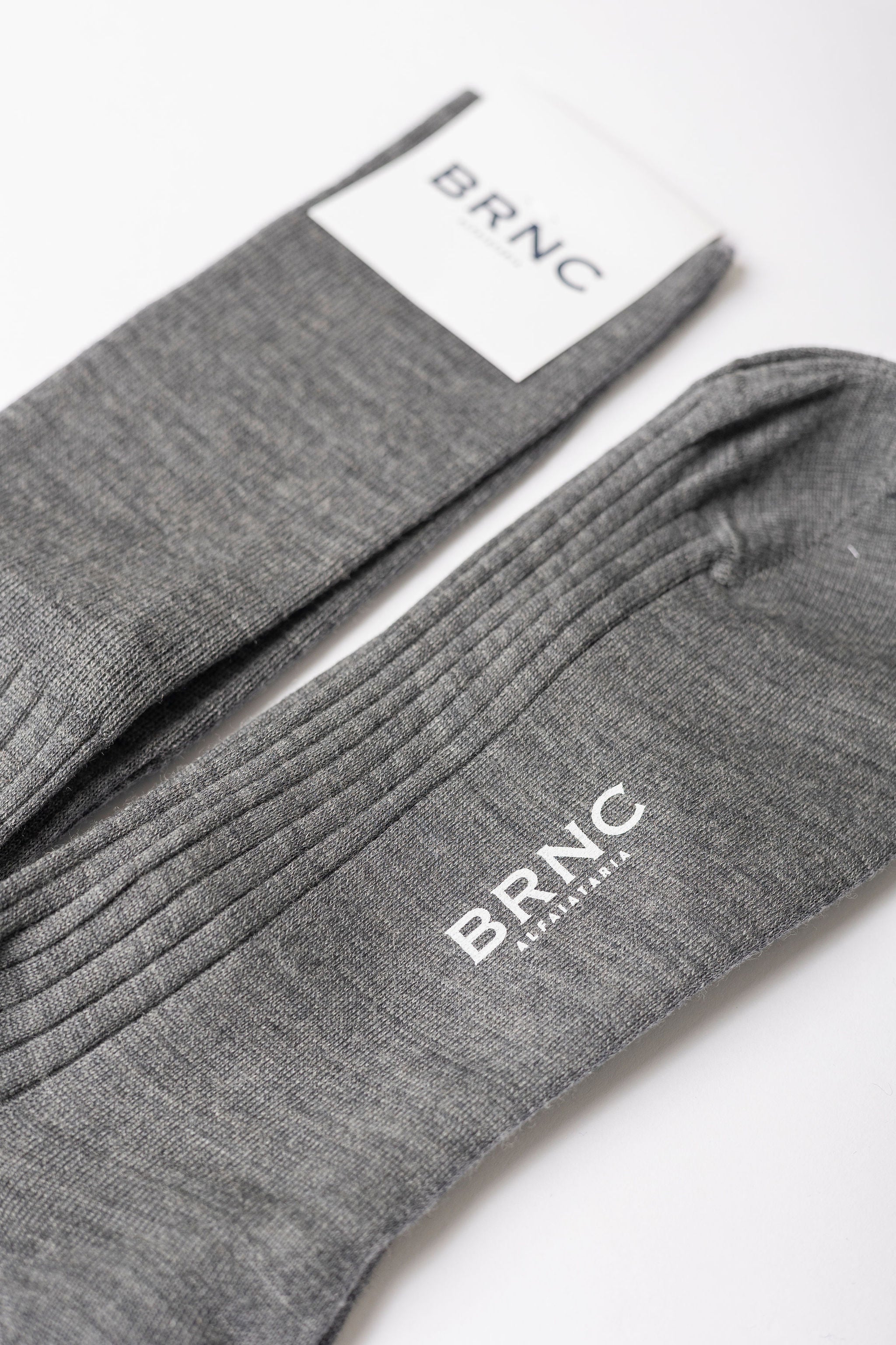 Meia canelada de cano médio com possibilidade de uso em trajes sociais ou casuais, confecccionada na Itália em lã com poliamida.