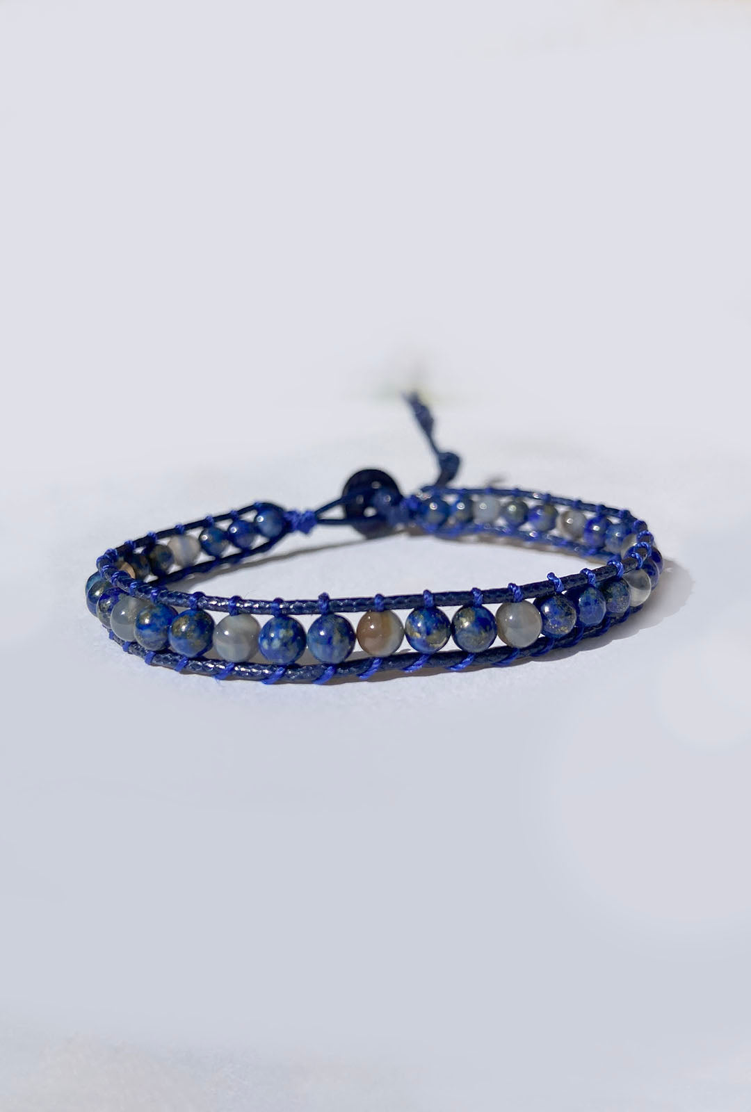 A pulseira Shambala é produzida artesanalmente com pedras naturais Lápis Lazuli, em fio de couro azul com botão de madrepérola.