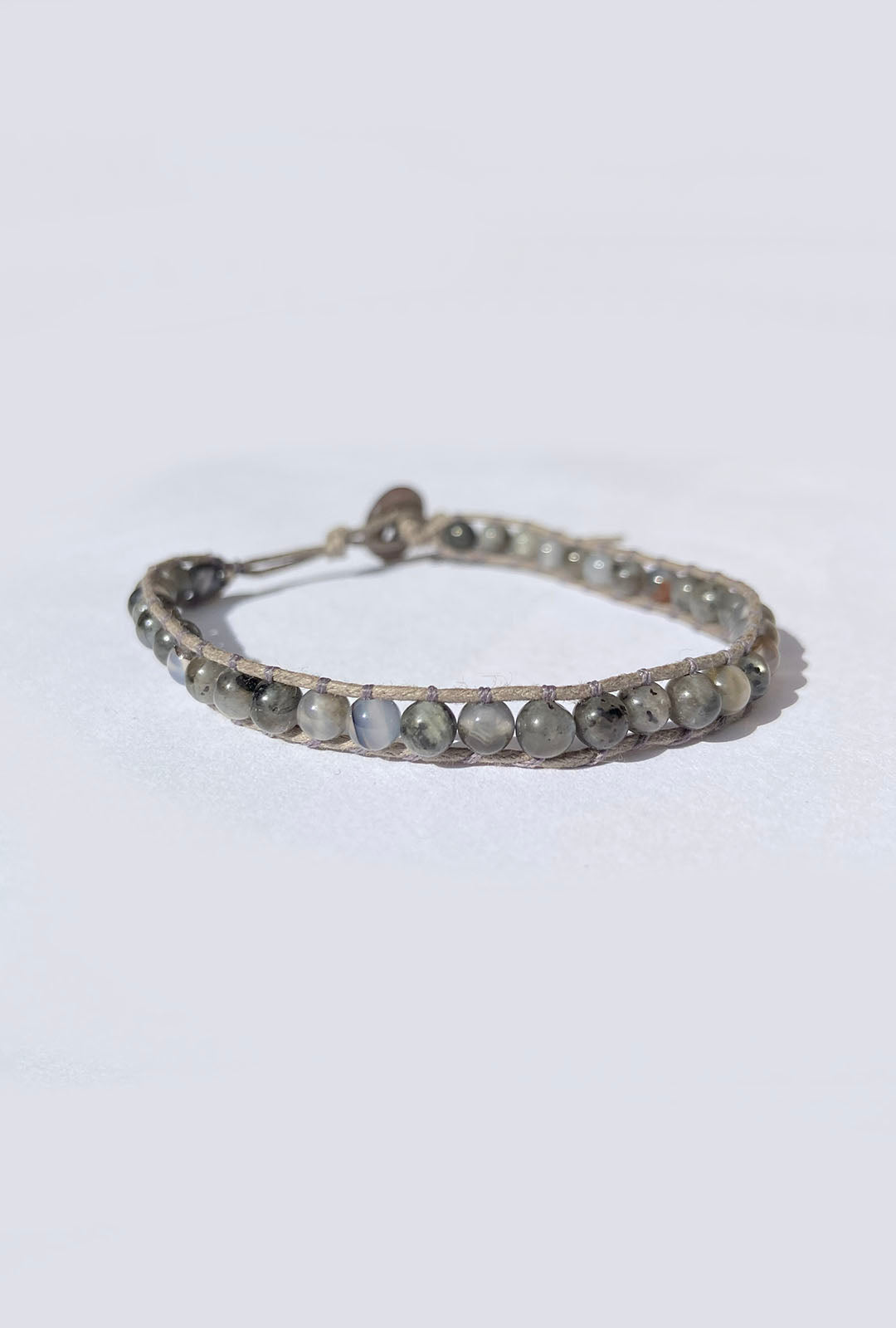 A pulseira Shambala é produzida artesanalmente com Pedras da Lua, em fio de algodão com botão madrepérola cinza.