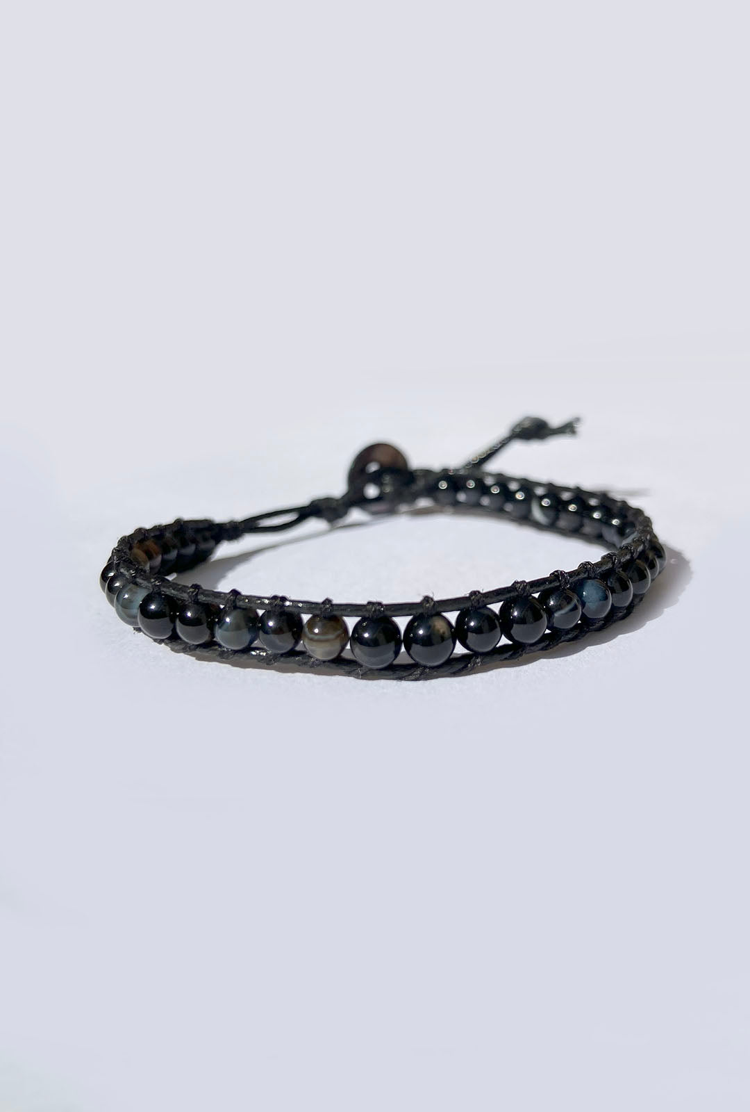 A pulseira Shambala é produzida artesanalmente com pedras naturais Onix e fio de couro preto com botão de madrepérola.