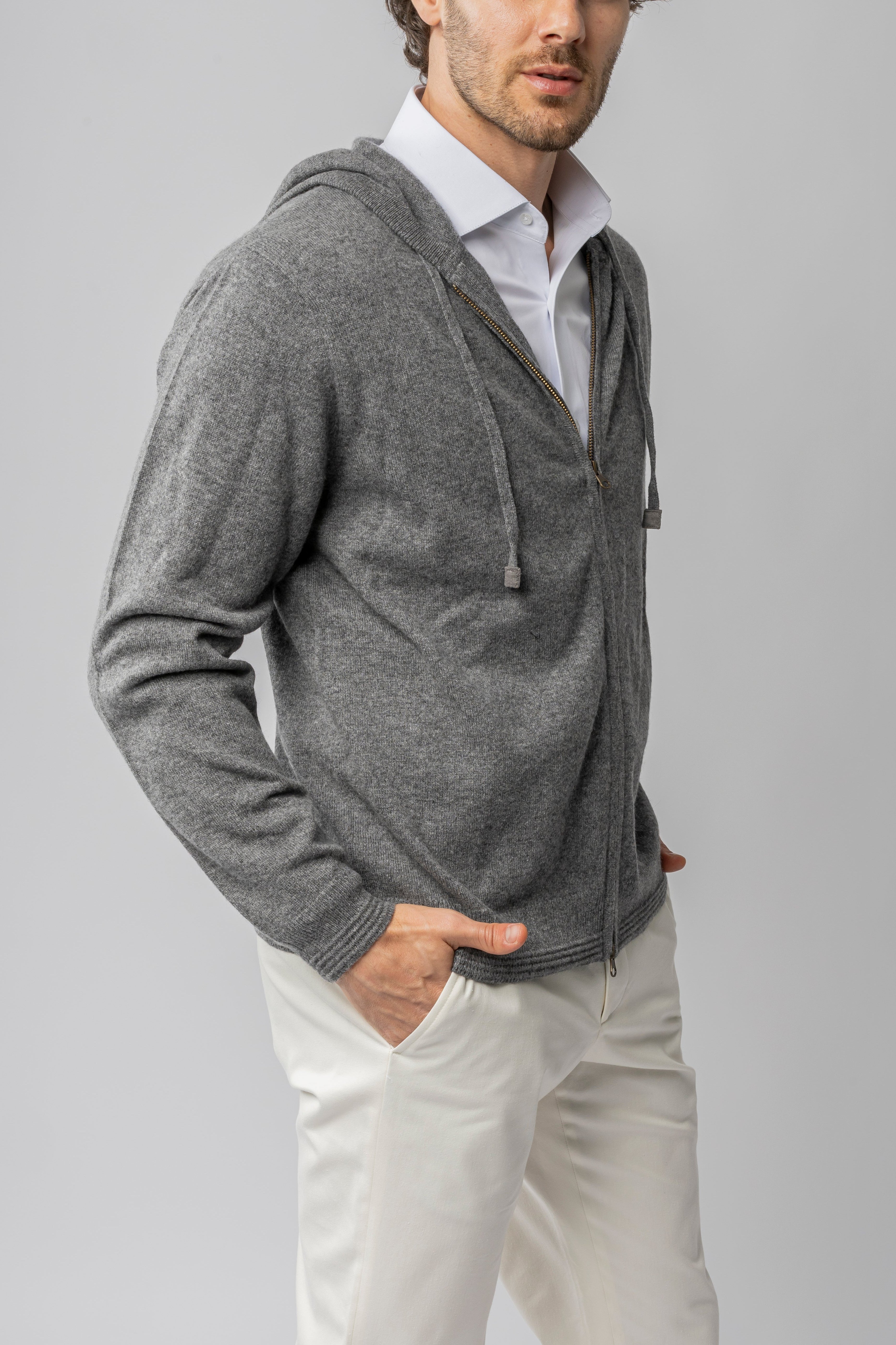 Tricô confeccionado na Itália 100% em cashmere natural com capuz e zíper frontal. O cashmere garante excelente conforto térmico com toque extremamente macio e suave.